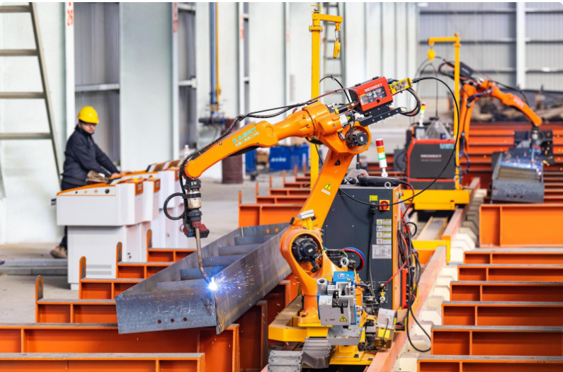 在鸿星东南建筑科技(新疆)有限公司智能制造产业基地,焊接机器人正在焊接钢结构材料。何龙 摄
