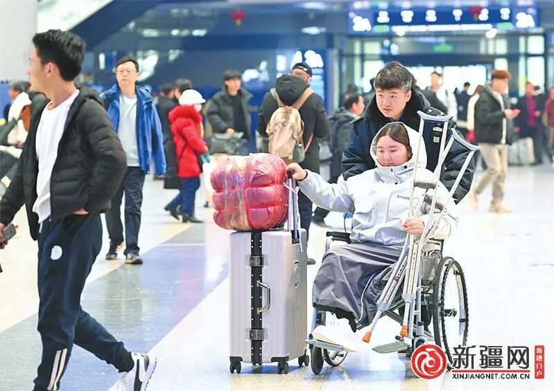 3月4日,在乌鲁木齐站候车大厅,“天山雪莲”服务队队员管东旭正在对重点旅客进行轮椅推送服务。(记者陈岩摄)