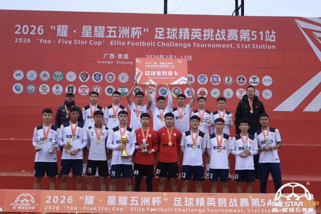 近日,2026“耀·星耀五洲杯”足球精英挑战赛第51站在广西贵港市圆满落幕。阿勒泰地区第二高级中学U18男足代表队奋勇拼搏、表现突出,成功斩获本次赛事U18组冠军,为新疆校园足球再添亮眼成绩。