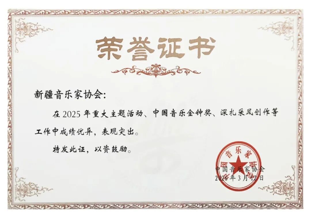 本次工作会议上,新疆音乐家协会荣获表彰,表彰协会在2025年重大主题活动、中国音乐金钟奖、音乐惠民展演及深扎采风创作等工作中的优异成绩和突出表现。
