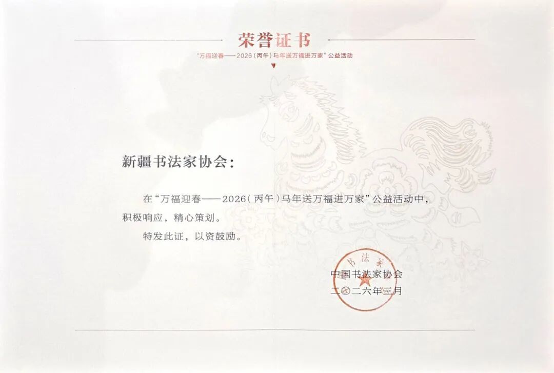 3月23日,中国书法家协会发布《关于表彰“万福迎春——2026(丙午)马年送万福进万家”公益活动优秀团体会员、先进集体和先进个人的决定》。新疆书法家协会荣获优秀团体会员称号,和田地区书法家协会、喀什地区书法家协会、塔城地区书法家协会、乌鲁木齐市书法家协会、伊犁州书法家协会荣获先进集体称号。