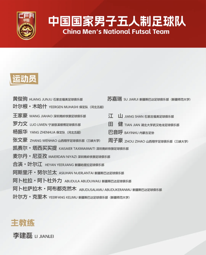 “与上期集训名单相比,本期新球员占比达70%。更多年轻人进入国家队,通过更多大赛历练,希望球队能实现全新变化与提升。”主教练李建磊对全新的国家队寄予厚望,“希望通过大家的共同努力,让中国队重返亚洲一流行列。”近两个赛季,李建磊执教新疆斯巴达队参加五超联赛。