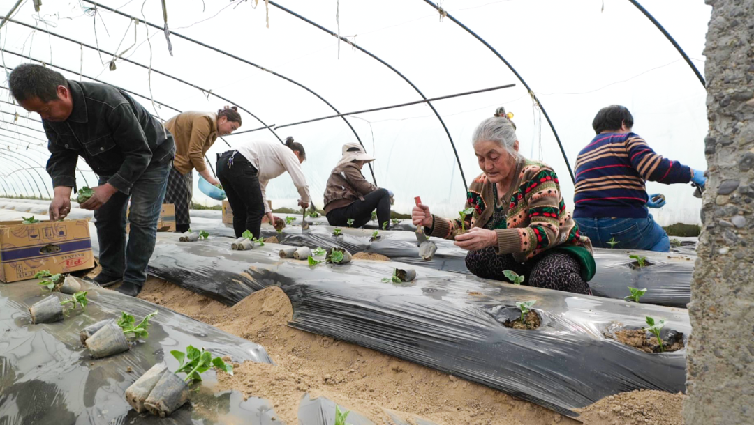 蔬菜大棚内,村民分工协作,移栽菜苗。