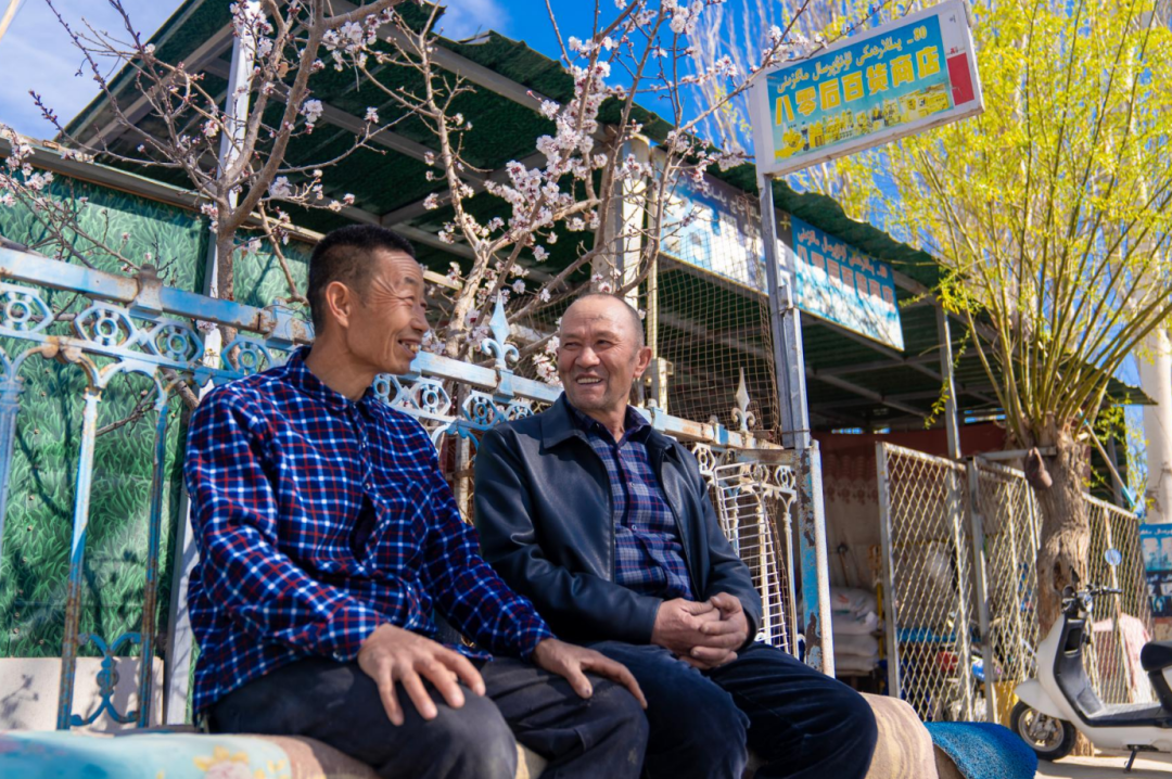 “八零后百货商店”门口,村民师立民(左)与店主库尔班江·木萨(右)坐在一起拉家常。