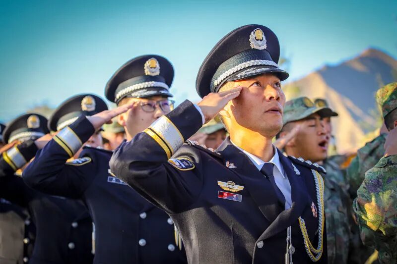 新疆出入境边防检查总站克州边境管理支队木吉边境派出所昆提别斯警务室民警杨哲参加升旗仪式。通讯员 牟虹帆摄