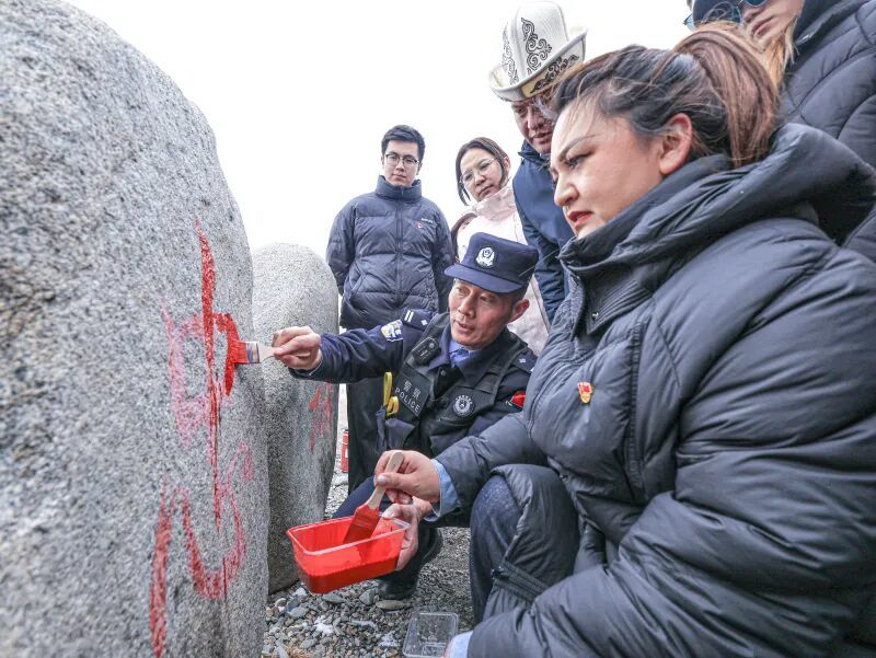 3月5日,杨哲与辖区群众一同为“戍边石”描红。通讯员 牟虹帆摄