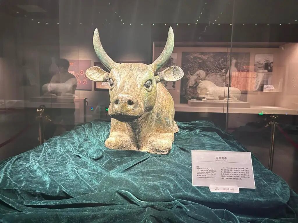 西夏陵出土的石马和鎏金铜牛在宁夏博物馆同一展厅展出,见证千年前游牧与农耕文明交融。(图片来源:新华社)