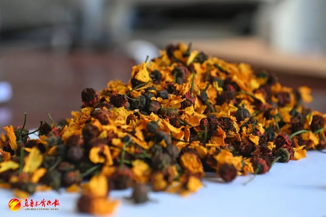 在乌拉泊街道派出所的桌子上,放着晒干的雪菊。(3月26日摄)
