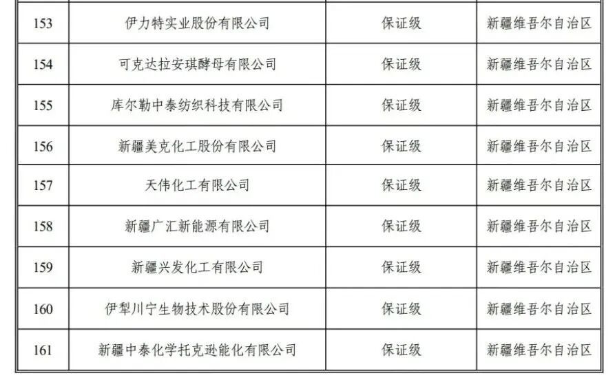 上榜的9家新疆企业分别为,伊力特实业股份有限公司、可克达拉安琪酵母有限公司、库尔勒中泰纺织科技有限公司、新疆美克化工股份有限公司、天伟化工有限公司、新疆广汇新能源有限公司、新疆兴发化工有限公司、伊犁川宁生物技术股份有限公司和新疆中泰化学托克逊能化有限公司。