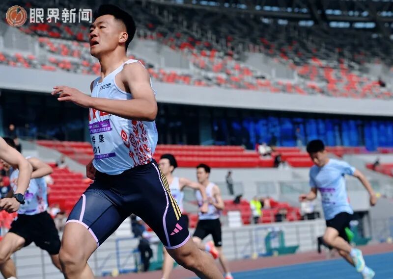 4月11日,在乌鲁木齐奥体中心田径馆,参赛选手正在进行男子100米比赛。 记者陈岩摄